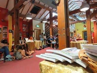 האירוע התחיל בבזאר למכירת ספרים – מיני פיצוי על יריד הספרים הנהוג בשבוע הספר העברי שלא התקיים השנה בחיפה. קיבלנו שולחנות קפה חינניים, מכוסים במפות דמויות קטיפה ועליו כל אחד ערך את יצירותיו כאוות נפשו. אנשים הסתובבו בין השולחנות, שאלו שאלות, התעניינו – ממש תחושה של יריד ספרים. גם אנחנו שהצגנו, הסתובבנו בין השולחנות, החלפנו חיוכים, חיבוקים, דיברנו על היצירות שלנו בגאווה רבה אך לא בגאוותנות.