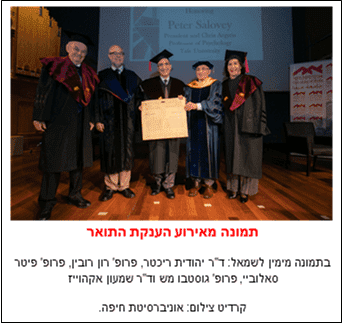 כחודשיים לאחר שהעניקה תואר ד"ר לשם כבוד לקנצלרית גרמניה, אוניברסיטת חיפה העניקה הבוקר (26.12.18) תואר ד"ר לשם כבוד גם לפרופסור פיטר סאלוביי (Peter Salovey), נשיא אוניברסיטת Yale האמריקאית, הנחשבת לאחת מעשר האוניברסיטאות הטובות בעולם, המבקר בארץ בימים אלו. התואר הוענק לסאלוביי בהוקרה על מחקריו פורצי הדרך ותרומתו המדעית בתחום הפסיכולוגיה בכלל ותחום האינטליגנציה הרגשית בפרט. נשיא אוניברסיטת חיפה, פרופ' רון רובין: "כושר מנהיגותו יוצא הדופן של פרופ' סאלוביי מעורר השראה אדירה באקדמיה. באמצעות תואר הכבוד אנחנו מבקשים להודות לו על מחקריו המכוננים ועל קשריו האיתנים עם האקדמיה הישראלית בכלל ועם אוניברסיטת חיפה בפרט".