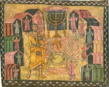 אהרון עונד את 12 אבני החושן על ליבו, 12 אבנים טובות כ 12 שבטי ישראל.