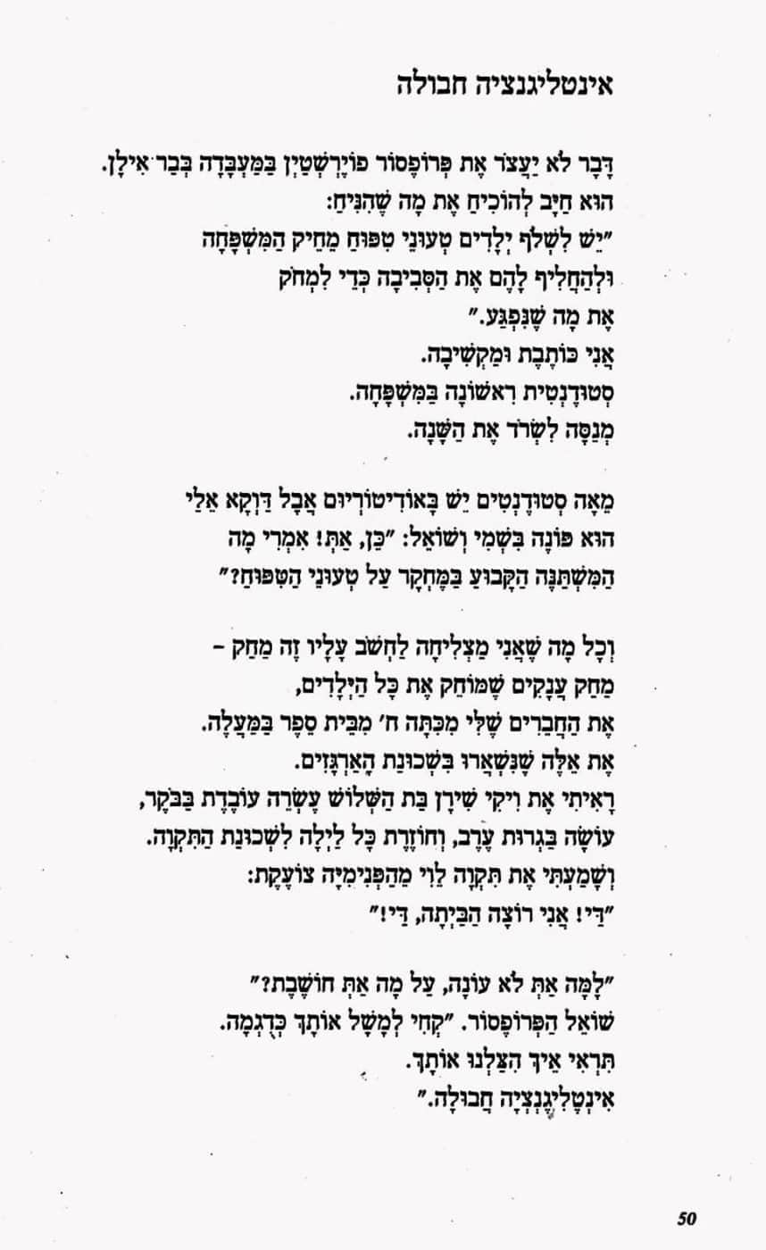 השיר שאני מביא כאן, ״אינטיליגנציה חבולה״, כבר הופך, להרגשתי, לשיר אייקוני בסוגו. הוא מיטיב לבטא חוויה אישית בתוך מסגרת ״כללית״; ודימוי המחק הענק, והאחווה הכואבת של הנמחקים/ות שגם שפתם נמחקה, נצרב בזיכרון בעוצמה. במידה מסויימת אין בו, אולי, את הצירוף שבין יצריות תאבת-חיים ועדינות נעצבת שמאפיין שירים אחרים,מלאי חיוניות ועוצמה.