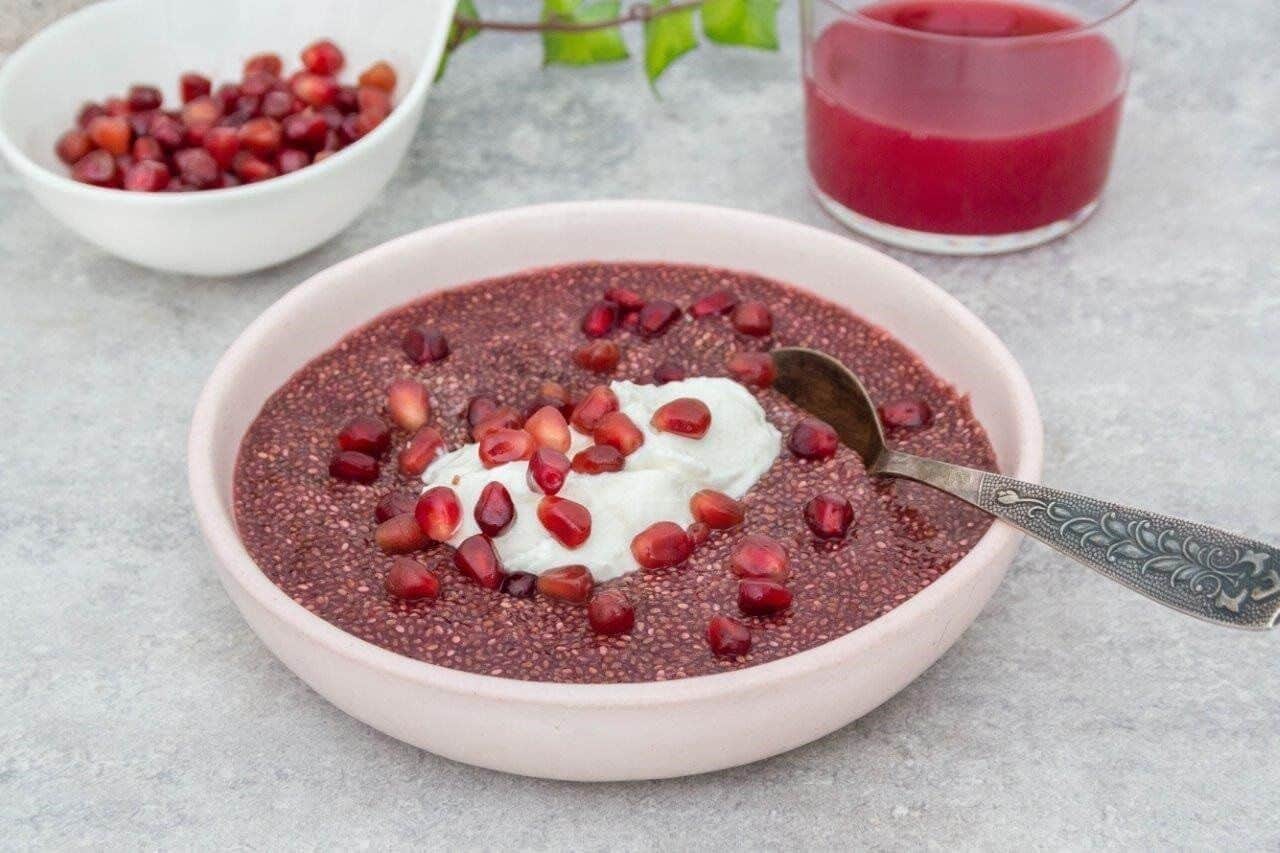 1. מערבבים היטב בקערה את זרעי הצ'יה, מיץ הרימונים והמייפל. מעבירים לקירור של חצי שעה או עד שכל הנוזלים נספגים בדייסה.