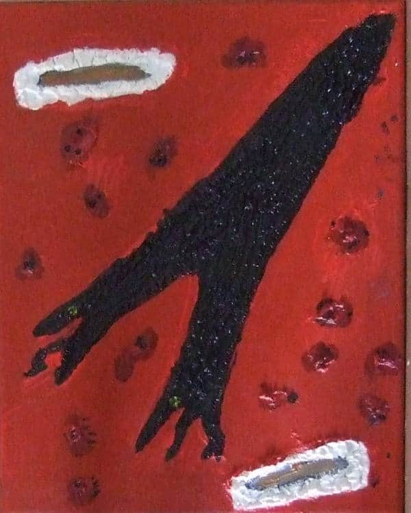 הרקע האדום אינו פולש מתוך ואל הציור. הוא נמצא בו גלוי וברור, וסביבו אותם פרצופים או עיגולי פרצופים. מקיף כל כולו את הענף השחור, מגן עליו? ואולי גם להיפך-הענף השחור מגן על הרקע האדום.