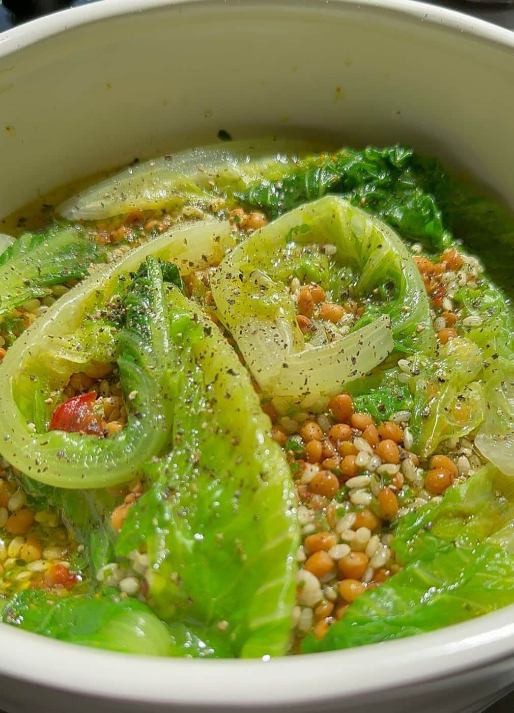 3. בסיר קדירה או בסיר מיועד לתנור נרכיב את המנה: נזלף 2 כפות שמן זית, נסדר את פרוסות תפוחי האדמה בתחתית, נשפוך מעל את תערובת האורז והעדשים ובין לבין נניח את עלי החסה. נניח מעל עלי חסה נוספים לעיטור ונפזר פלפל שחור גרוס.