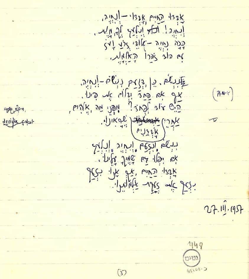 טיוטה לשיר "מנהיג" של מרדכי גלדמן, שאת ארכיונו מסדרת אהובה ישראל. והמלים נשמעות מוכרות וידועות.