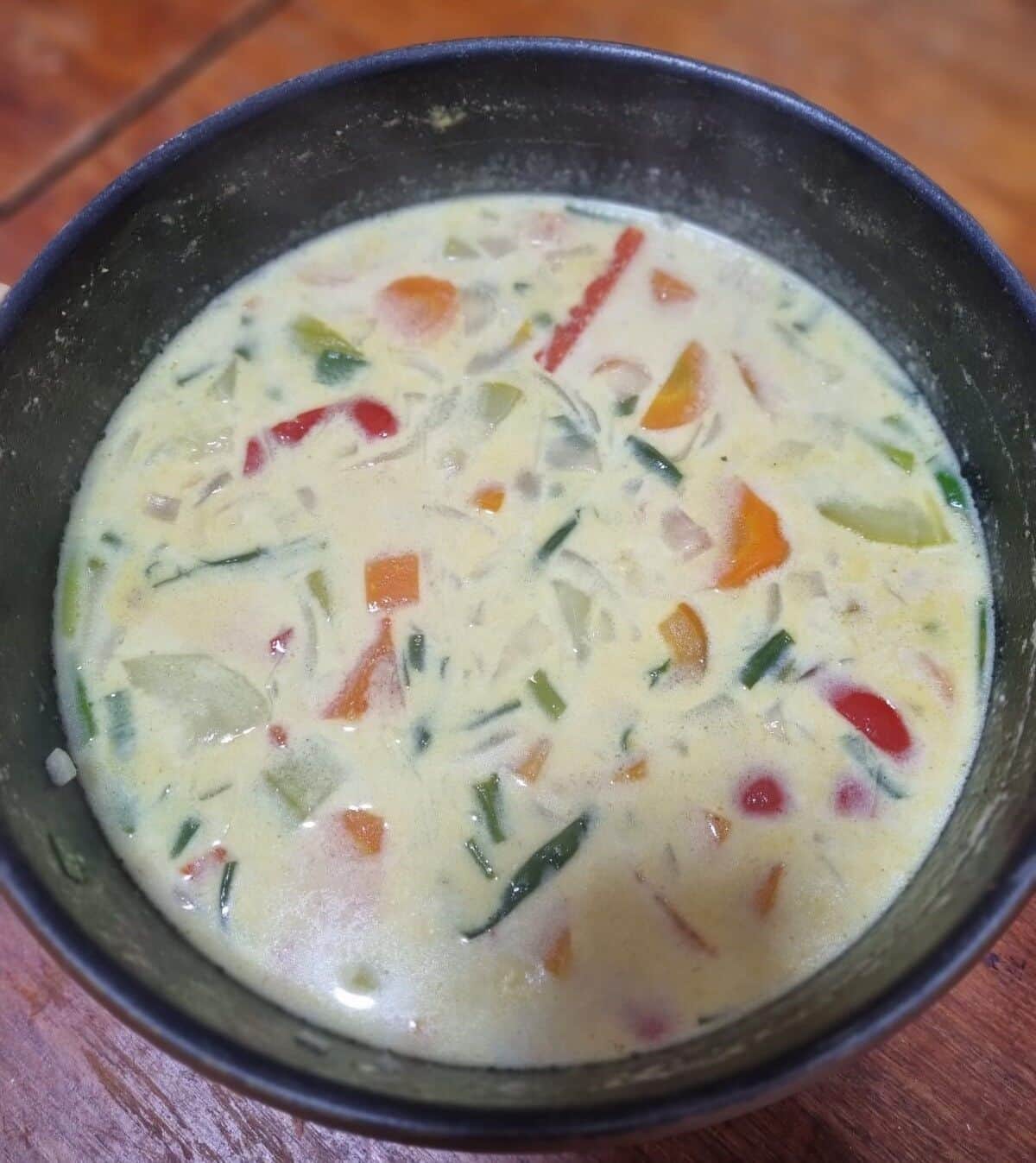 · להוסיף מיץ קוקוס, קישואים, פלפלים, בצל ירוק, לבשל חצי שעה