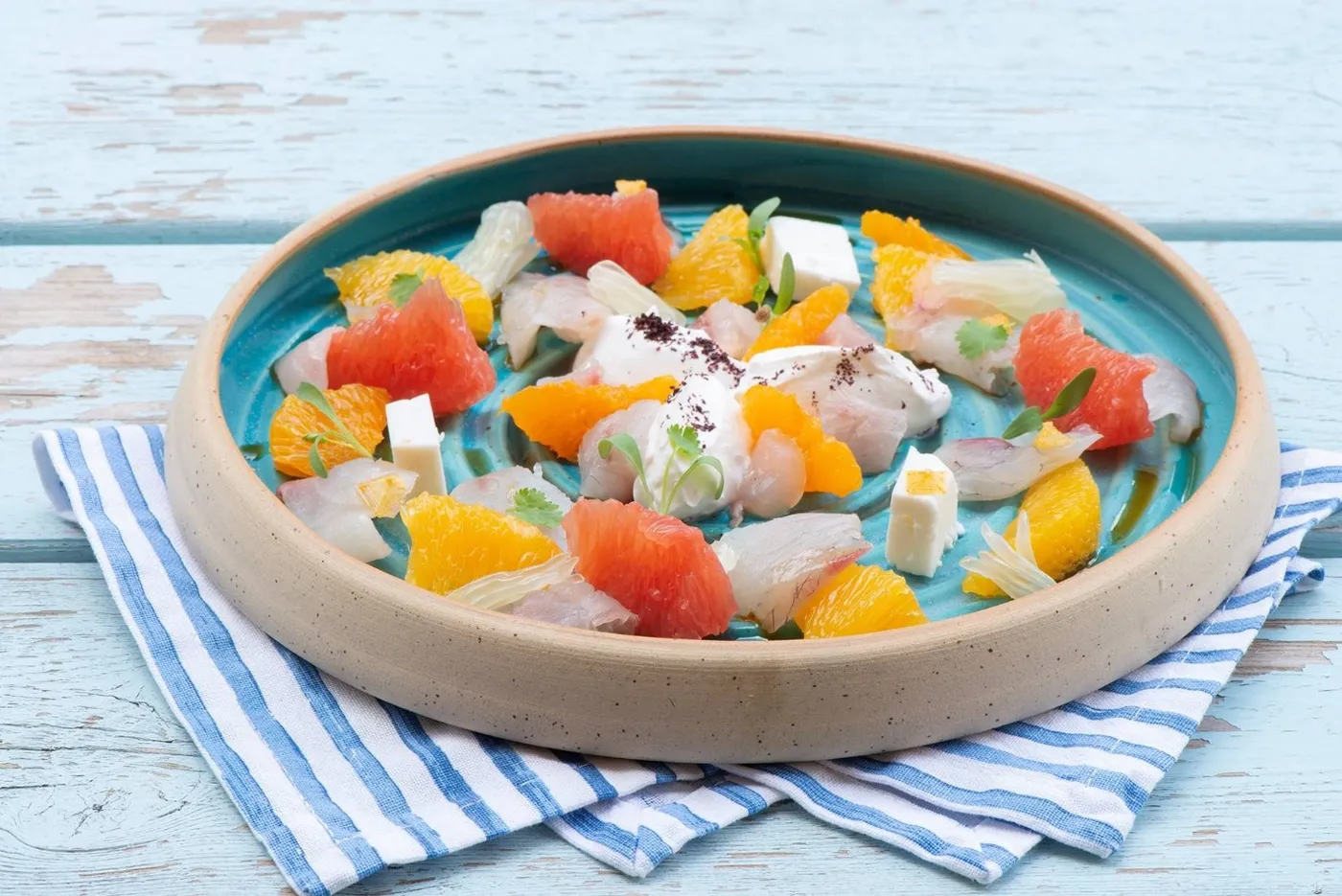 2.מסדרים בצלחת את פיסות הדג, פלחי הדרים מפולטים, קרם פרש וקוביות חלומי.