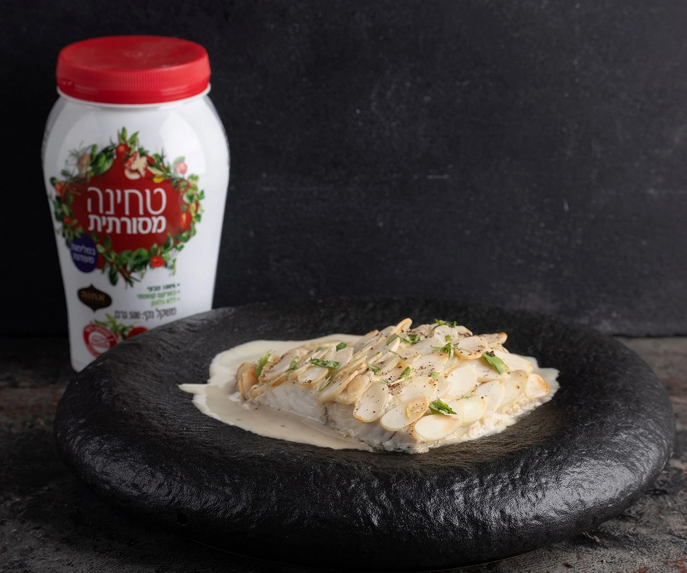 7.בצלחת הגשה מוזגים 2 כפות מהטחינה, מניחים מעל את הדג, מפזרים מעט פטרוזיליה קצוצה ומגישים.