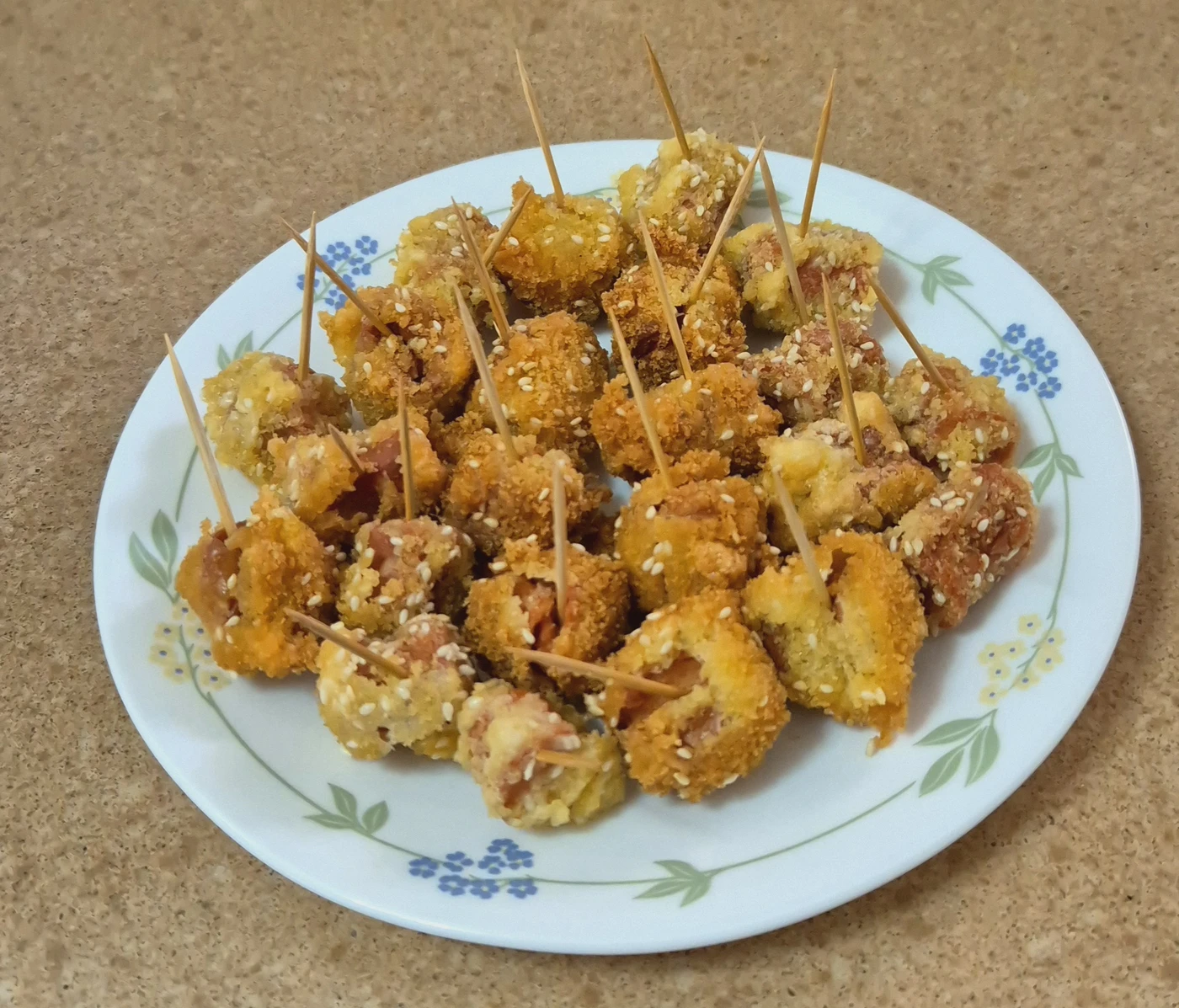 לעטוף את חתיכות הנקניקיות בקמח, ביצה, פרורי לחם