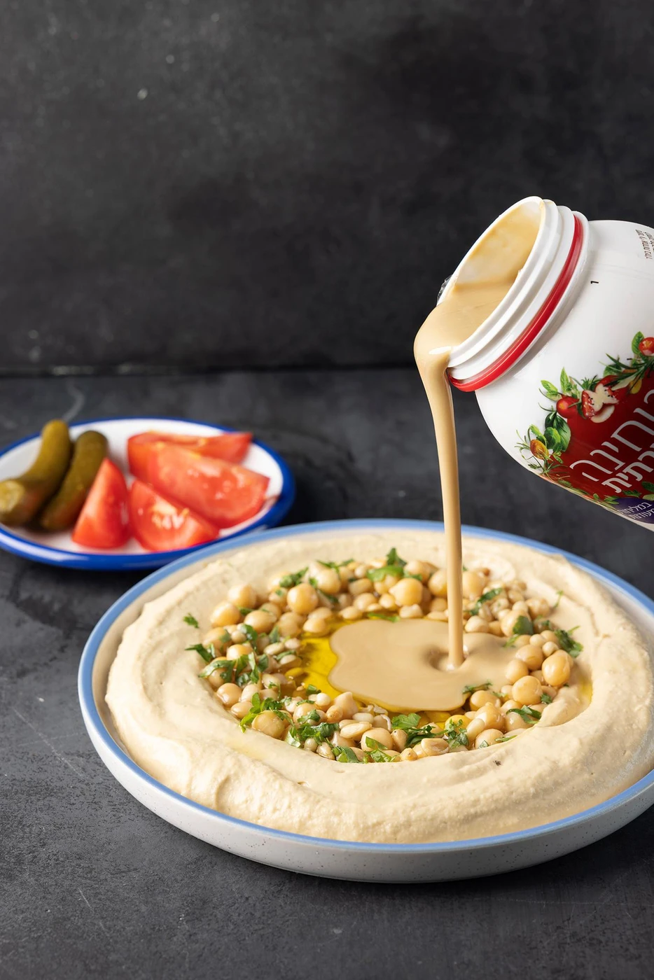5. מוזגים את החומוס לצלחת הגשה שטוחה ומקשטים עם גרגירי חומוס מבושלים שלמים, טחינה גולמית מזולפת מעל, כף שמן זית איכותי, פטרוזיליה קצוצה וצנוברים.