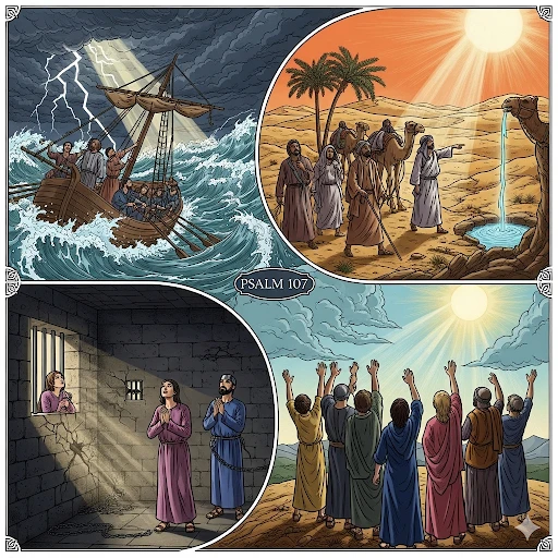 וזאת כונת המשורר במזמור ק“ז, להגיד רק קורות ימים שעברו, ולחתום את דבריו בדברים הנוגעים לתולדות שאול ודור המלך, והולך ומספר המשורר במליצתו הנשגבה בדרך הפלגה גדולה, איך יצאו בני ישראל מארץ מצרים, ואיך נאספו ונלקטו אחת לאחת מארבע רוחות הארץ, ואיך תעו אחרי כן במדבר בישימון דרך, והיו רעבים וגם צמאים, ויצעקו אל ה' בצר להם, ומיד ונפש רעבה מלא טוב, כי נתן להם מים ואת המן, אך כאשר עצת עליון נאצו, ורצו בשר תאוה נתן להם את השלו, אשר היה לזרא באפם, ויזעקו לה' וירפאם; ואחרי כן ידמה המשורר את כל הליכותם במדבר לאנשים אשר ילכו באניה בלב ים, ואחר כמה צרות ורעות שעברו עליהם יבואו למחוז חפצם, אז יודו לה' חסדו ויספרו נפלאותיו; כן היו בני ישראל ג”כ אז, כאשר באו עיף ונלאה לא“י, אל הנחלה והמנוחה, ויספרו ג”כ את נפלאותיו כי ישם נהרות למדבר וגו' ישים מדבר לאגמי מים וכדומה67 ואחרי כן יספר איך נתישבו בני ישראל בארץ ויזרעו שדות ויטעו כרמים ויברכם וירבו מאד, והצלחתם עלתה כפורחת, אבל לא לארך ימים, כי פתאם הלכו אחורנית, וימעטו וישחו, סבת הדבר מעצר רעה כי קם עליהם עוצר ומושל רע הוא שאול המלך, ובא עליהם יגון, כי הרים את לבו מאחיו, ושפך בוז על נדיבים והם נדיבי עם, כי לא רצה לדרוש בה‘, ולשמוע לדברי הנביא וכהן, וישם את שמואל והכהן לחרפה, וערך קרבות כאות נפשו, ויתעם בתהו לא דרך והוציא להרג עמו בחנם; אך בחמלת ה’ על עמו לא האריך ימים על ממשלתו, וישגב אביון מעוני, כי ה' בחר את דוד העני ורש מן הנוה למלך, וישם כצאן משפחות; ומגביל היטב לעמת וימעטו וישחו הנאמר על שאוּל: יראו ישרים וישמחו וכל עולה קפצה פיה, כי המלך הזה הלך בדרך ה' ונוצר תורתו מאד.