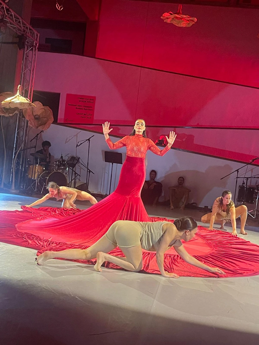 שמלתה אדומה ענקית, קטיפה בוהקת מתפרסת לכל סנטימטר באולם.