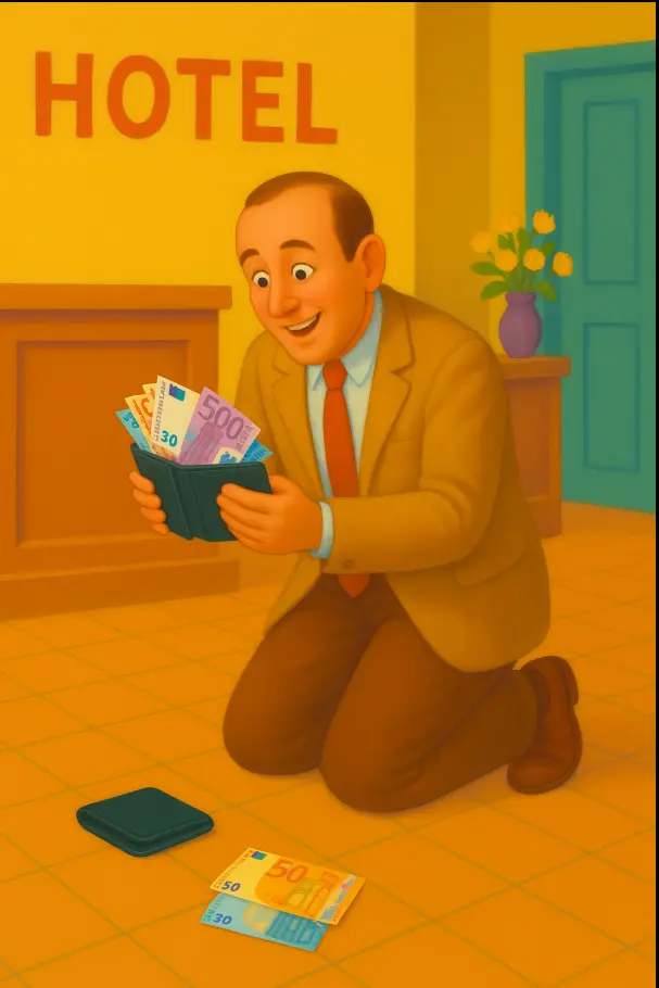 ואז הבחין בעל המלון, שעל הריצפה מונח ארנק תפוח. ברור היה לו שהוא נפל מכיסו של האורח לרגע. אבל לבעל בית המלון לא היה איכפת. זה נראה לו כמתת משמים. הוא ספר את הכסף שבארנק - היו שם.... חמשת-אלפים אירוֹ.