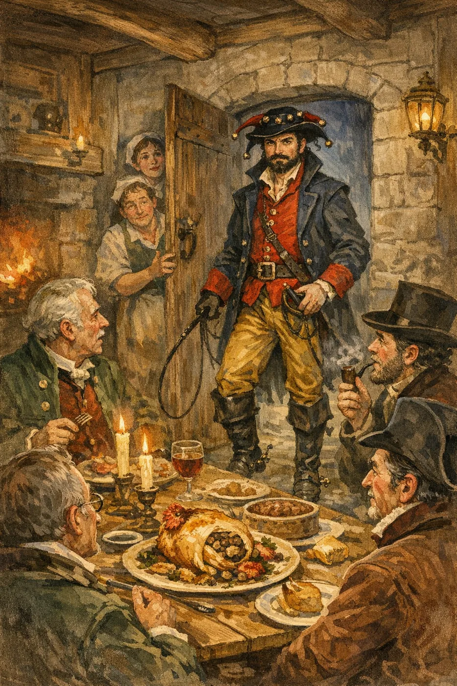 ארוחת בוקר של בשר תרנגול מבושל ממולא בפטריות כמהין, מלווה בממרח אווז נוסח פריגה, הוא מאכל ידוע לאניני הטעם הצרפתי, ארוחה שהחזירה את כול הנוסעים למצב רוח טוב. בעוד אנו סועדים את ליבנו, נכנס לפונדק אדם צעיר בצעד מהיר. עיניו סרקו את המקום, הופעתו המוזרה משכה את תשומת לבי, והעניקה נושא לשיחה עתידית לחבורת נוסעי הכרכרה שלנו. היה זה גבר גבוה ורזה, הוא אחז בשוט ארוך, ודורבנות מגפיו היו משובצות בריקועי מתכת ושפם וזקן לחיים שחורים עיטר את פניו. הוא לבש כובע מקושט בפעמונים, מעיל כחול שצווארונו נוקשה, מקטורן אדום, אברקיים צהובים מעור, ומגפיו הגיעו עד לברכיו. תחילה חשבתי שהוא עגלון כרכרות או בלדר מיוחד. אבל, לאחר בירור, הסתבר שהוא היה בנו של נוטריון ציבורי, ושהוא לבוש בצורה מוזרה זו כיד הדמיון הטובה עליו.