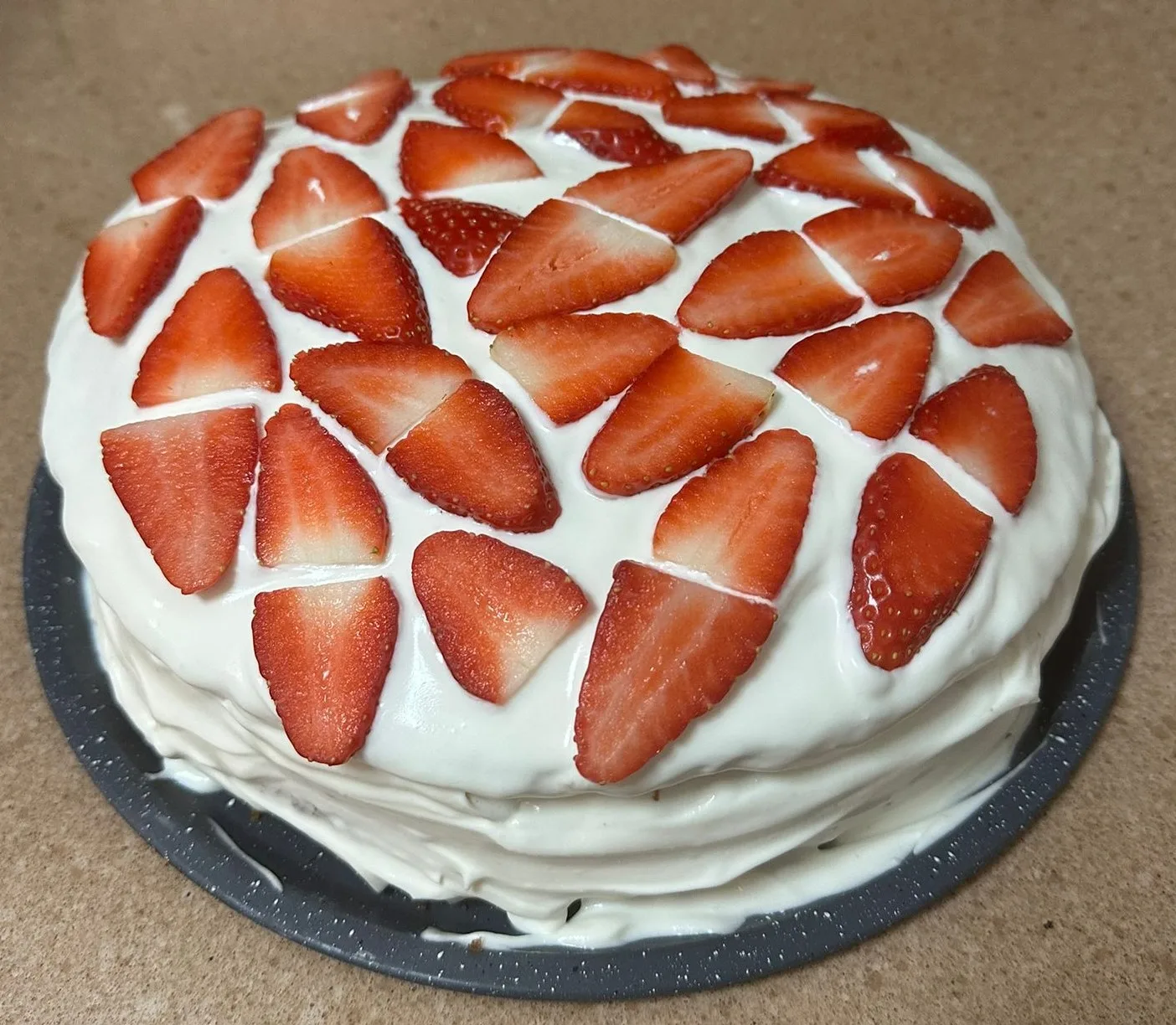 להניח את השכבה השלישית, רוב הקרם הנותר, לקשט עם פרוסות התות הדקות