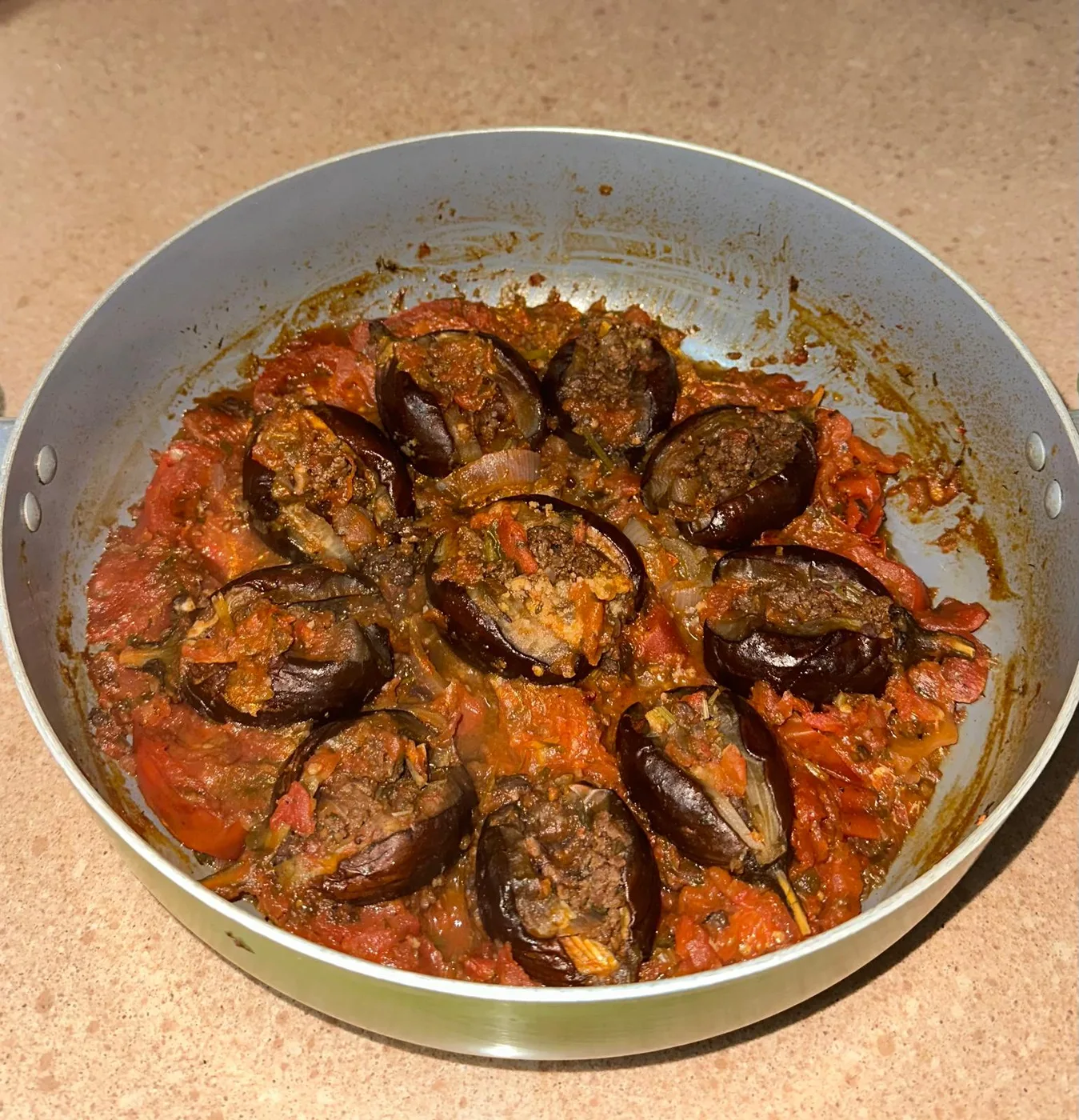 ליצור חריצים בחצילונים, מלא את החצילונים בתערוכת בשר וירקות