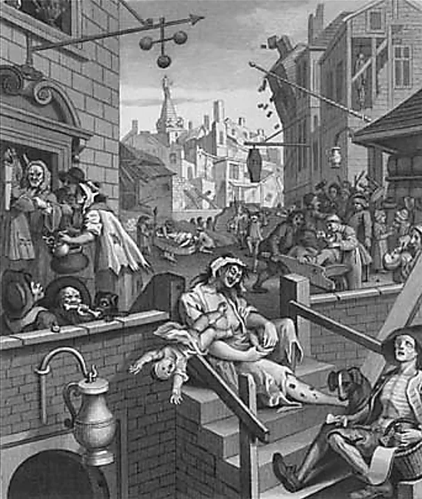 חיילים אנגלים ששירתו בהולנד הביאו עמם את הג'ין למולדתם. ובהיעדר משהו טוב יותר - ובעיקר זול יותר - האנגלים התחילו לשתות את הג'ין בכמויות הולכות וגדלות. ו'יליאם ומרי שמלכו בסוף המאה ה-17 הכריזו מלחמה על יבוא משקאות ועודדו ייצור משקאות אלכוהוליים מקומיים - שהיו ג'ין, ג'ין, ועוד ג'ין. כפי שכבר ציינתי, ייצור הג'ין הוא פשוט וקל ובעיקר זול, באנגליה ייצר ג'ין. הג'ין נמכר בפרוטות והיה למשקה של העניים. השיכורים התגולל ברחובות בהמוניהם. האצולה האנגלית מיהרה לגנות את המשקה וכינתה אותו 'הורס האמהות'. היטיב לצייר זאת האנגלי בן-התקופה ו'יליאם הוגארת' (William Hogarth, 1697-1764) בתחריט שלו 'סימטת הג'ין' (Gin Lane). גס, זאת המילה העולה על הדעת כשחושבים על ג'ין. יש לו ריח גס ויש לו טעם גס. אז איך זה מסתדר עם התדמית המתוחכמת של המרטיני? פשיטא. ראית באיזה גביע מגישים את המרטיני? גאון מי שחשב על זה. גביע כזה, מה שתשים בו ייראה מתוחכם!