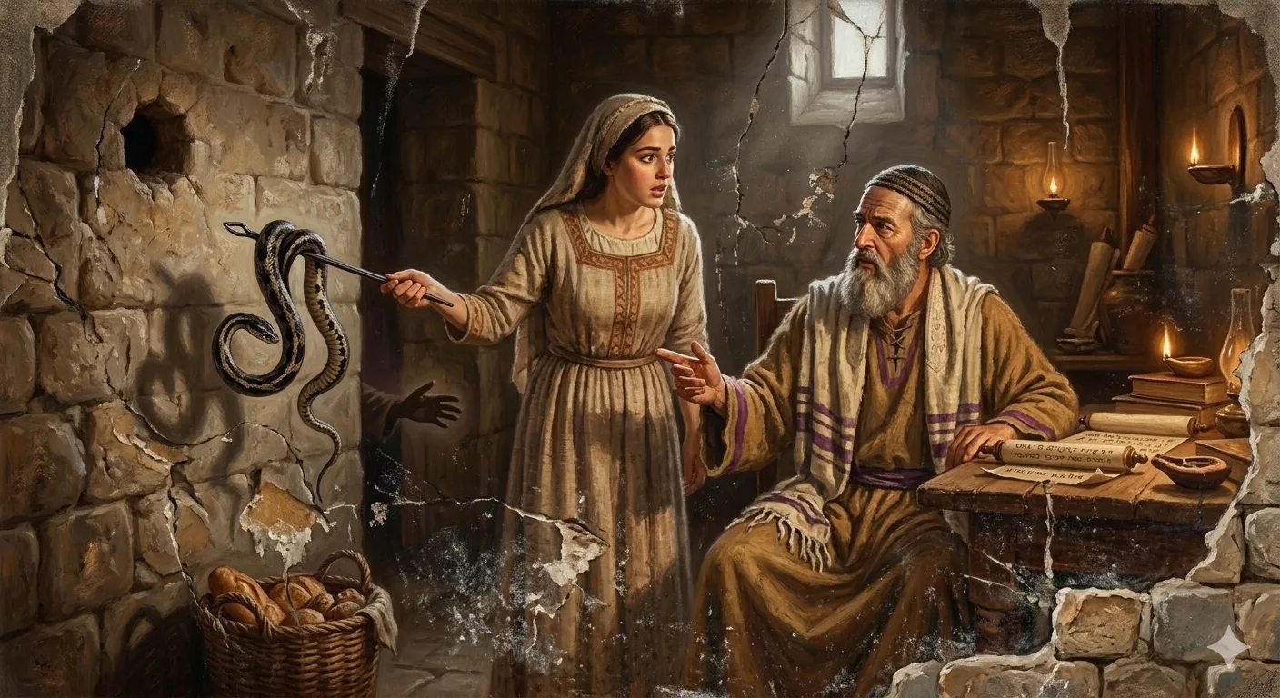 בלילה, נטלה המכבנה (הסיכה) שלה ונעצה אותה בכותל, ופגעה בעינו של נחש והרגתו.