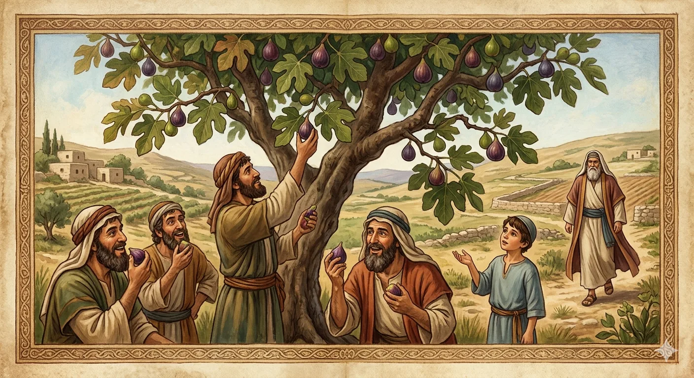 הָיוּ יוֹשְׁבִים תַּחַת הַתְּאֵנָה. אָמר לה: תְּאֵנָה תְּאֵנָה, הוֹצִיאִי פֵּרוֹתַיִךְ וְיֹאכְלוּ פּוֹעֲלֵי אַבָּא.