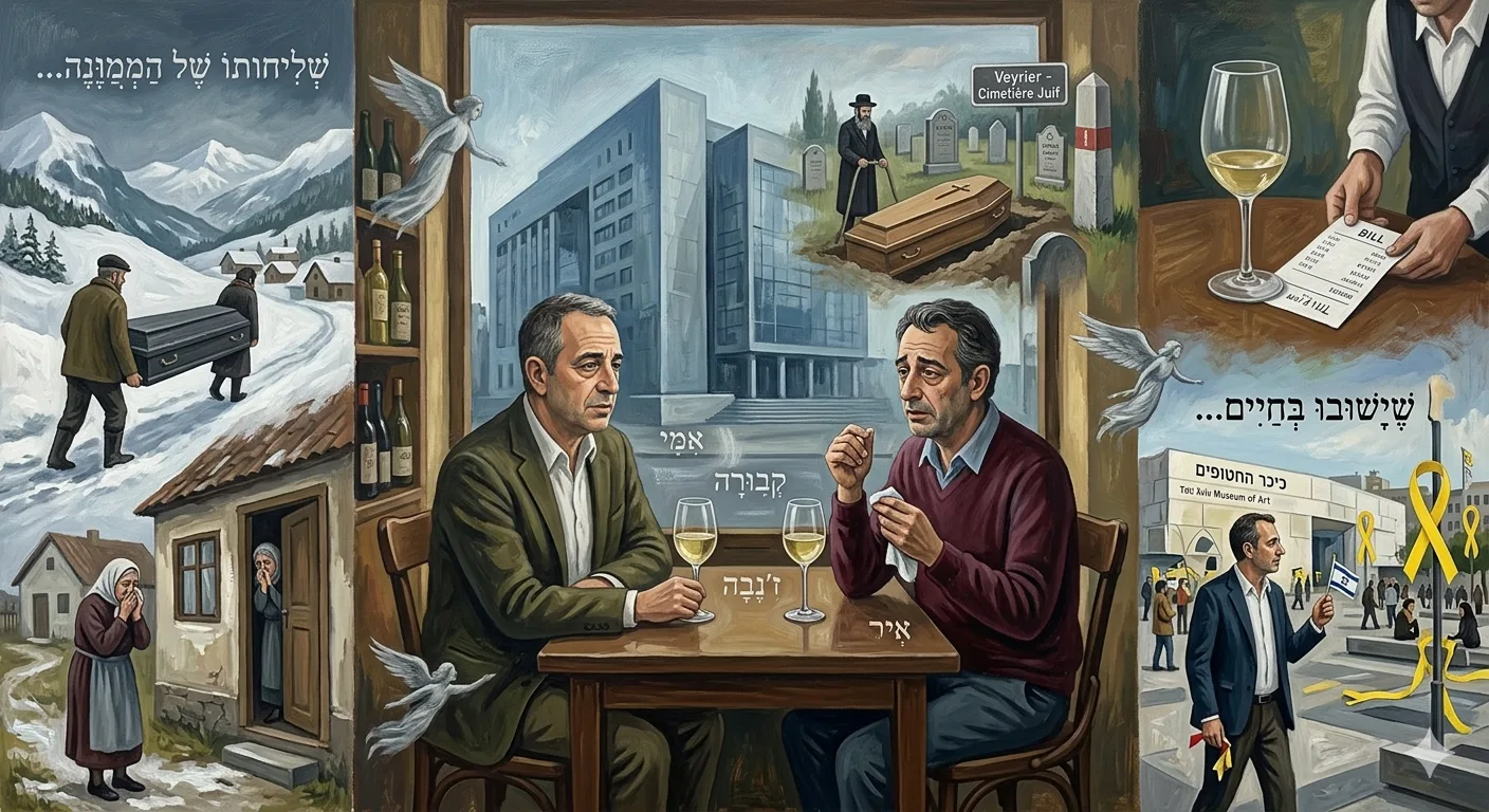 עד שסיימתי את הרהורי, הגעתי אל חנות היין המלבבת ובה שולחנות עץ קטנים. המפגש היה מלנכולי משהו, באשר מ. הציץ בשעון והודיע שעליו לצאת לניחום אבלים, מה עוד הוסיף שרוחו נכאה בשל פטירת אמו לפני שבועות ספורים, וכך שבמקום לספר לי את הסיפור שרצה לספר התגלגלה השיחה על אמו המנוחה שנפטרה בשיבה טובה, בגיל מופלג בבית הורים מהודר בסמיכות למקום בו ישבנו.